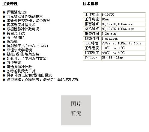 具有信号捕捉能力强,误报、漏报率低,低功耗和真实温度补偿的特点。产品技术含量高、制作工艺考究、外观造型高雅,而且性能稳定,使用寿命期长。特殊的透镜设计,无下视死角,既可墙挂式也可吸顶式安装。配合RA93安装支架会更加方便地施工和安装