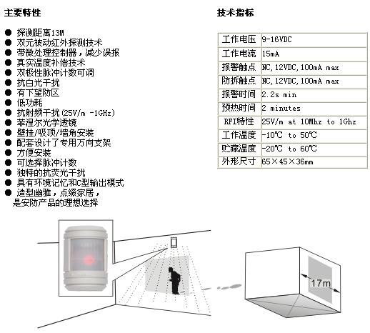 HC-9308双元红外幕帘式被动移动探测器。专门设计的最适用于家庭使用的探测器。具有信号捕捉能力强,误报、漏报率低,低功耗和真实温度补偿的特点。产品技术含量高、制作工艺考究、外观造型高雅,而且性能稳定,使用寿命期长。特殊的透镜设计,无下视死角,既可墙挂式也可吸顶式安装。配合RA93安装支架会更加方便地施工和安装